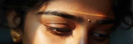 Morning light highlights sindoor line on forehead, emphasizing beauty and cultural significance in a peaceful setting, creating a soft, warm glow.
