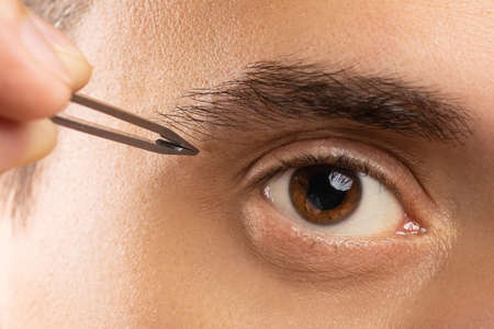 Man plucking eyebrows. Close-up of removing excess hair with tweezers. Isolated on white background. A male looks into the frame and it feels like he is looking in the mirror
