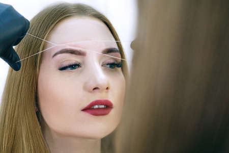The girl beautician marks with the help of thread eyebrow tattoo. Permanent makeup. Permanent tattooing of eyebrows.