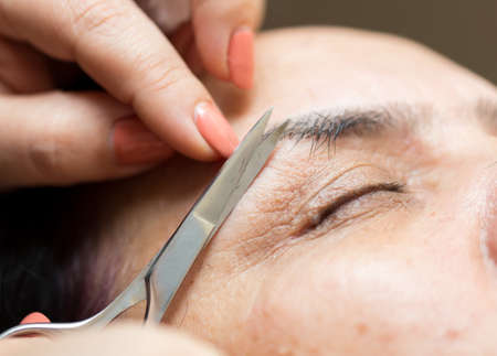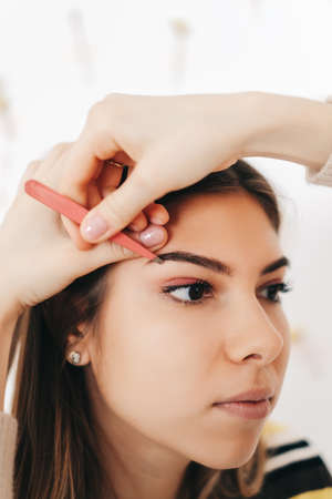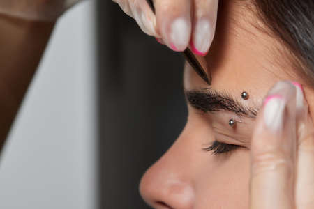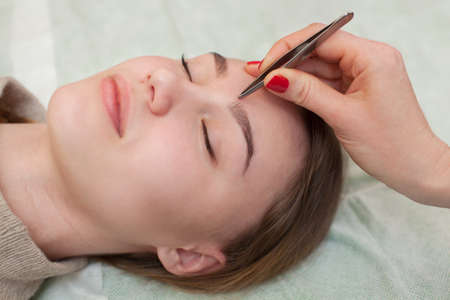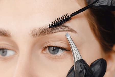 Eyebrow shaping procedure, make-up master uses tweezers to shape the eyebrows. High quality photo