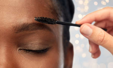 face of african woman and hand with mascara brush