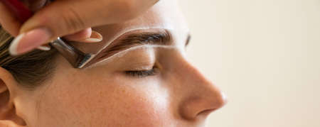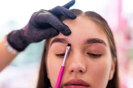 A young woman undergoes an eyebrow correction procedure in a beauty salon, close-up. the girl paints her eyebrows in the salon.