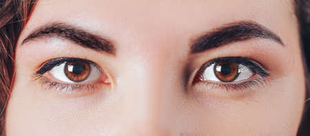 Close up of a beautiful female eye and a processed eyebrow, macro shot