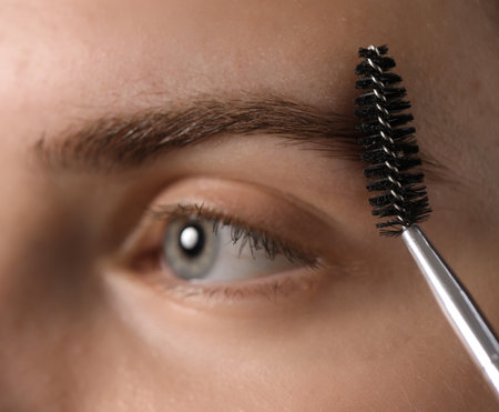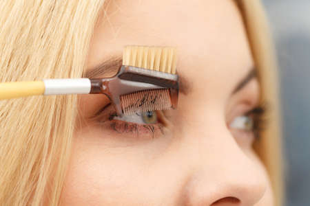 Closeup beautiful woman with eyebrow brush tool, makeup artist combs eyebrows close up.