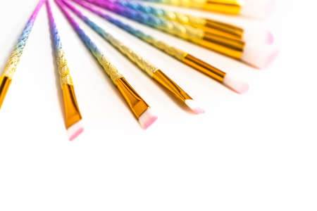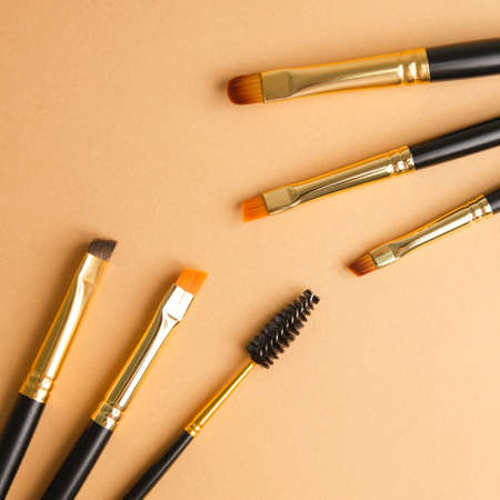 Makeup artist's brushes on an isolated background. Set of gold and black brow brushes concept.
