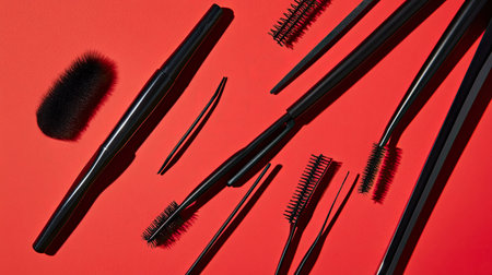A stunning arrangement of various makeup tools and accessories placed on a bold red backdrop, showcasing the essentials for any beauty lover or professional.