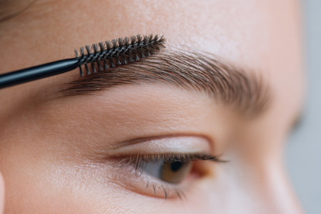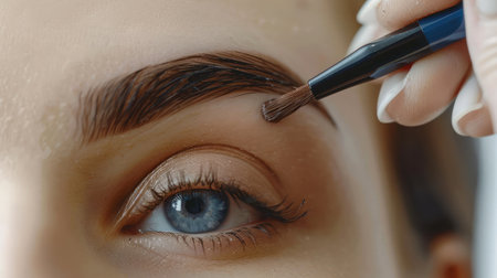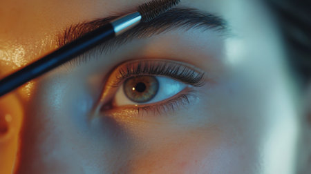 A close-up view of a young woman grooming her eyebrow with a brush, showcasing her eye details and skin texture in a modern beauty setting. Perfect for beauty and skincare themes.