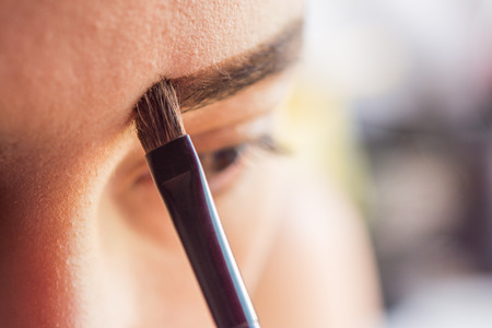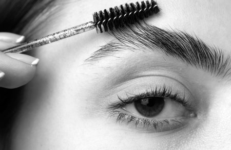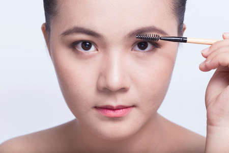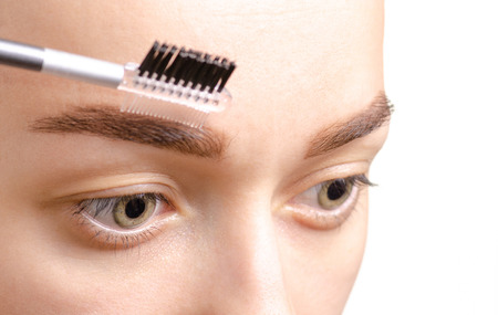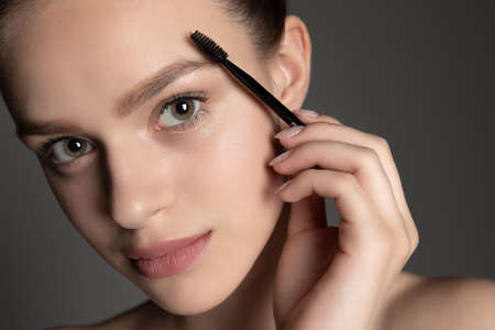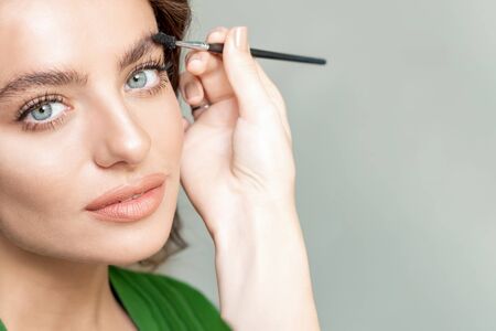 Closeup beautiful woman with eyebrow brush tool, makeup artist combs eyebrows with copy space.