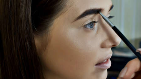 Woman stylist makeup artist making eyebrow shape form for girl, face closeup. Young woman fashion model beauty salon. Applying paint using brush. Glamour stylish fashion industry. Visagiste working.