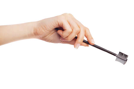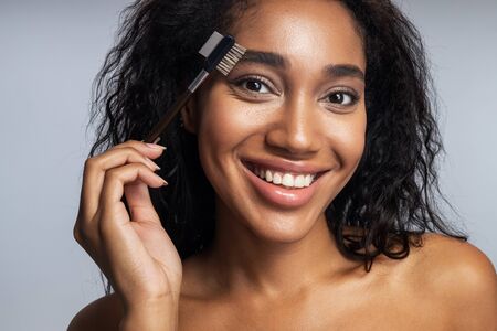 Cute lady posing for camera with brush for eyebrows. Cosmetics and female beauty concept