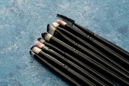 Makeup brushes, everyday make-up tools. Cosmetic essentials on blue background, closeup.