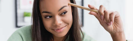 Young woman dyed her eyebrows with henna and holds a brush next to her face