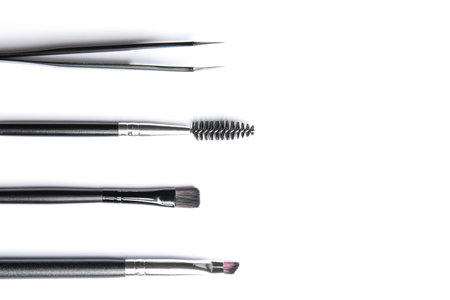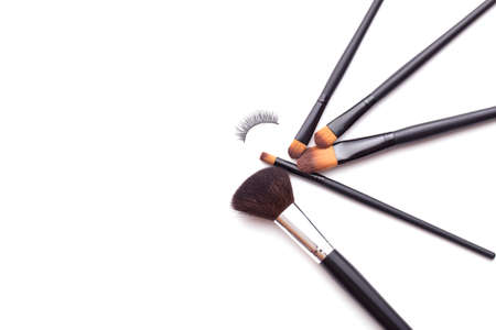 Flat lay top view of female cosmetics brushes set for makeup on white background. Cosmetics and beauty concept. Make up concept with space for text.