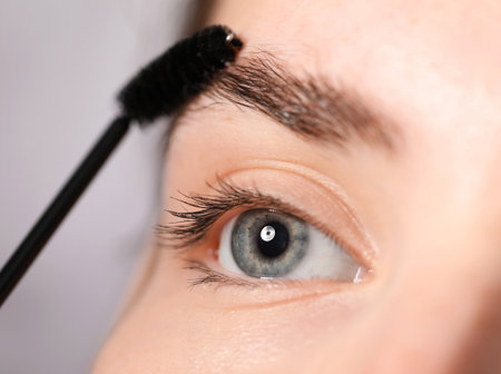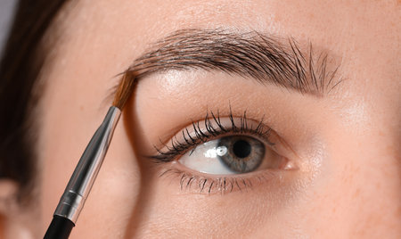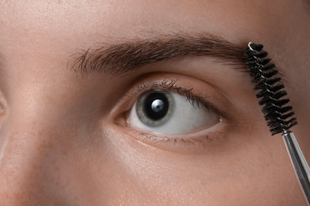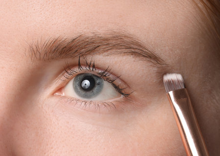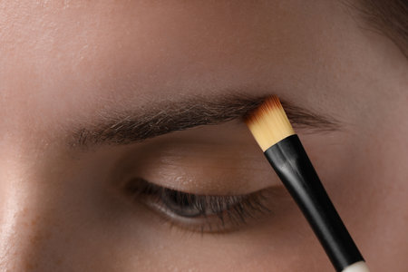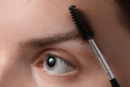 Young woman applying cosmetic product onto her eyebrow with brush, closeup