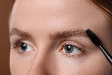Young woman brushing her eyebrow with spoolie on brown background, closeup