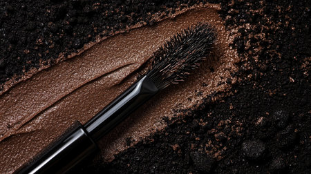 This artistic image features a close-up of a brown mascara wand resting on a dark, glossy background, highlighting its creamy texture and beauty application.