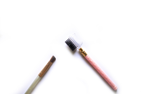 Set of brushes for eyelashes and eyebrows on pink background. Correction and care. Cooling and laying. Womens cosmetics.