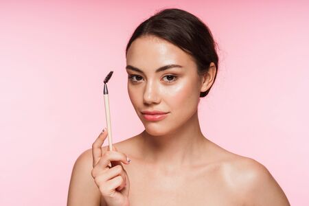Beauty portrait of a beautiful young topless brunette woman standing isolated over pink background, holding eyebrows brush