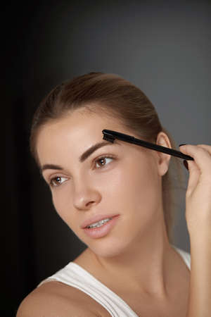 Modeling brows, gorgeous charming lady with beauty face, healthy clear skin, holds brush in hand and paint her eyebrows. Macro close up of brows.