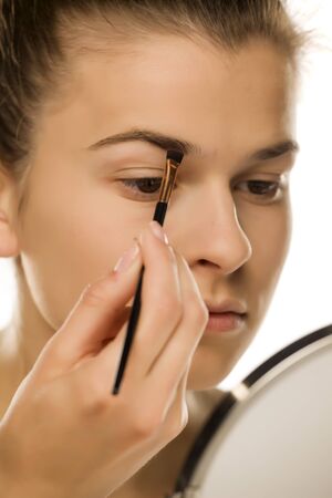 beautiful latina woman making up her eyebrows in front of the mirror. girl at home doing an eyeliner and painting her eyebrows with a makeup brush. beauty concept, cosmetics and craftsmanship.
