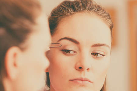 Woman plucking eyebrows depilating with tweezers. Attractive girl tweezing eye brows looking in bathroom mirror.