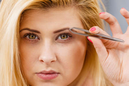 Woman plucking eyebrows depilating with tweezers closeup part of face. Girl tweezing removing her facial hairs..