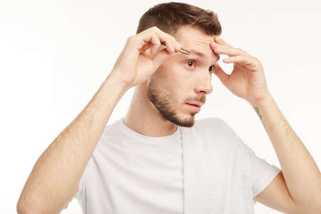 Male Eyebrow Tweezing. Face Beauty Concept Of Grooming. Closeup Of Model Removing Brow Hair With Tweezers. Hair Correction.