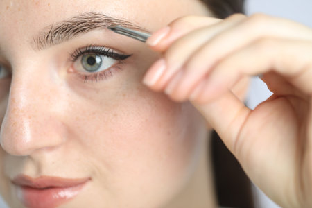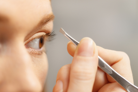 Young woman plucking eyebrows with tweezers close up. Beautiful woman gets eyebrow correction procedure. Young girl tweezing her eyebrows in beauty salon.