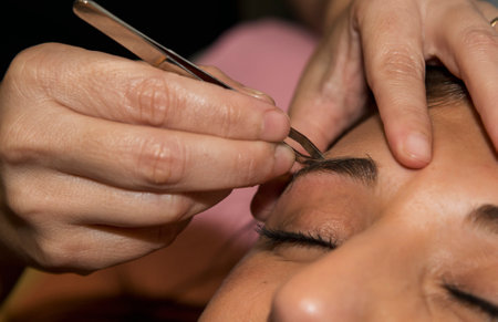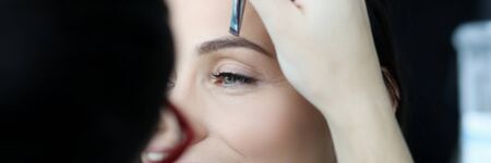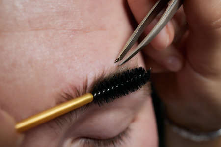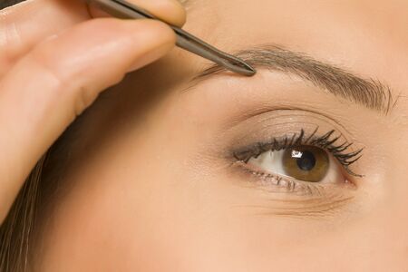 Eyebrow shaping procedure, make-up master uses tweezers to shape the eyebrows. High quality photo