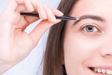 Closeup of female hand is holding cosmetic tweezers. Young smiling woman is plucking her brows, removing excess hairs. Eyebrow shaping tool. Personal hygiene, care, daily routine concept.