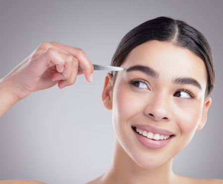 Shaping her eyebrows. Studio shot of an attractive young woman plucking her eyebrows against a grey background.