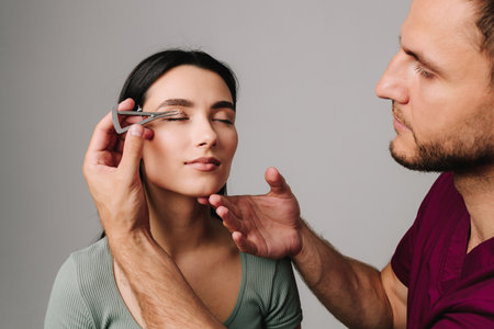 Makeup artist combs and plucks eyebrows after dyeing in a beauty salon.Professional makeup and cosmetology skin care.