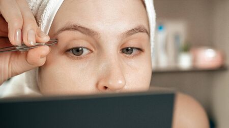 Plucking eyebrows. Girl with white towel on her head in bathroom looks in mirror and plucks her eyebrow hair with tweezers. Hygiene, beautician, makeup, face care concept. Close-up view
