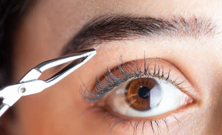 Close-up partial view of makeup artist holding curling tongs for eyelashes.