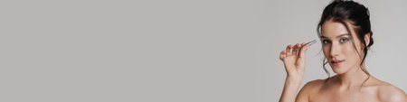 Beauty portrait of a young white woman with her brown hair up bare shoulders holding tweezers over gray wall background