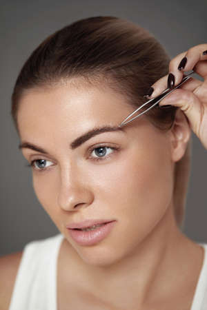 Eyebrow Correction. Beautiful young woman tweezing eyebrows. Model with beauty face plucking eyebrows.