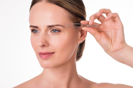 Perfect eyebrows. Cropped image of positive young woman using tweezers by pinching her eyebrows being on isolated white background