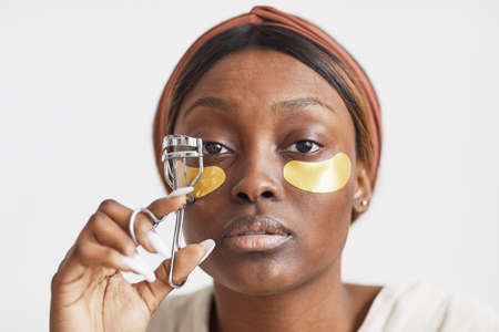 Minimal portrait of beautiful African-American woman enjoying skincare routine at home and curling eyelashes, copy space