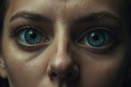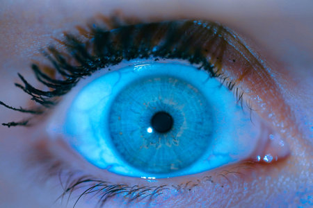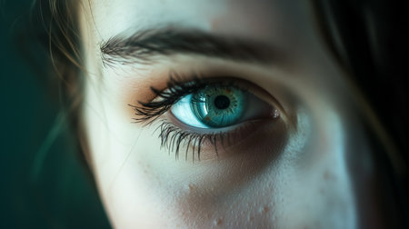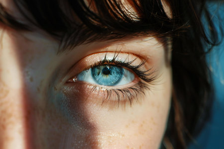 Captivating close-up of a human eye featuring a stunning blue iris, long lashes, and a natural brow, illuminated by soft light that enhances the intricate details of the eye and its expression.
