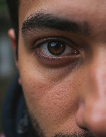 Selective focus eye of caucasian man. Macroshot texture of male skin surface, retina, eyelashes, eyebrows. Сoncept of importance of vision in human life. Eyesight is sensory sensation that perceives images.