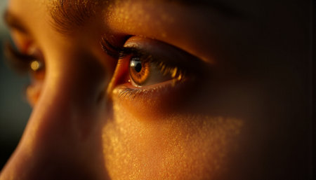 Close up of a human eye showcasing vibrant orange and yellow iris details, conveying depth and emotion, perfect for various artistic and health concepts