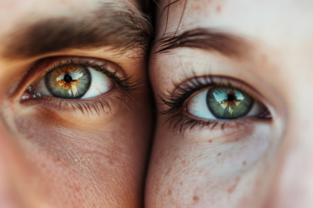 This close-up shot captures the intense gaze of two individuals as they lock eyes. The details of their irises, pupils, and eyelashes are clearly visible, conveying a sense of connection and emotion between them.
