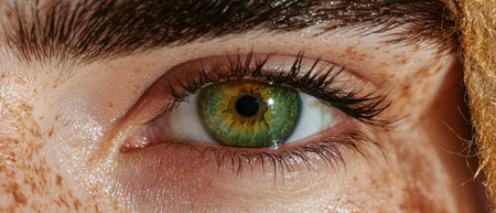 Female caucasian young adult's intense green eyes are strikingly highlighted in close-up, with freckles and distinct eyelashes. the interplay of light and shadow enhances the rich color and texture, creating a captivating and detailed expression.