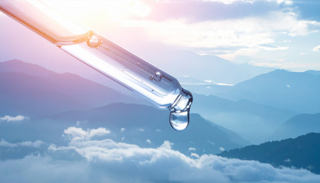 A close-up of a dropper with a liquid drop against a backdrop of misty mountains. Clear details and vibrant co...