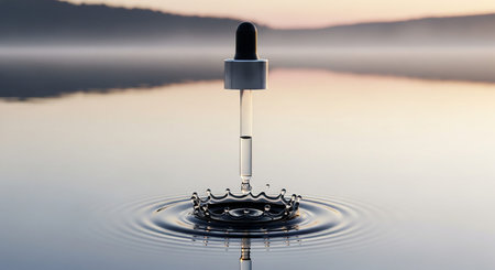 showing pipette dropping liquid creating water splash crown and ripples on calm lake surface at dawn. resolution