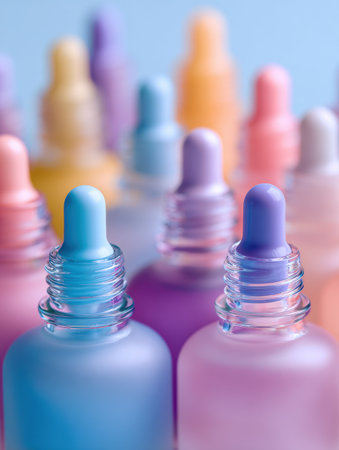 Colorful dermocosmetic bottles are artistically placed on a softly lit counter, showcasing vibrant hues against a pastel background.
