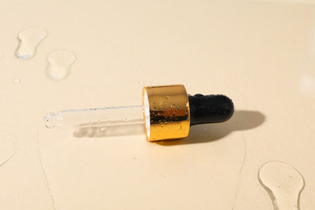 The texture of serum or oil with a pipette on a beige background.