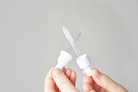 Hands holding dropper caps against neutral background for skincare and cosmetics use.