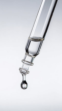 Clear drop of liquid falling from a glass dropper over a smooth white surface, representing purity and precision in science and beauty applications