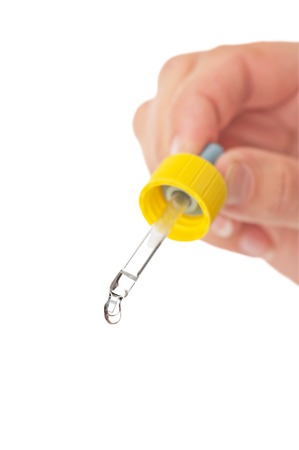 Pipette in a hand of the person on a white background